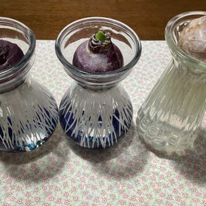 水栽培ヒヤシンス始めてから20日 室内に入れてから10日目 根がだいぶ伸びて来ました 色によって芽の伸び具合も 違って今のところ白が一番伸びてます 紫🪻頑張れ!!