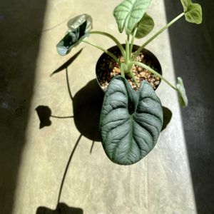 2025.9.6 アロカシアシルバードラゴン 小さいけれど暴れん坊に育ってて、置き場に困る子 もう2本葉っぱポッキリ折っちゃったよ😥 影が濃い