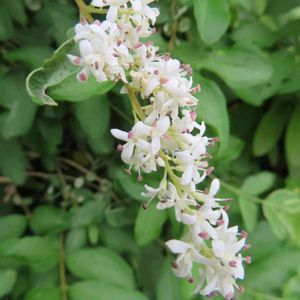 初見のお花~コミノネズミモチ 漢字だと小実鼠黐、ワー書けない😵 台湾、マレーシア、ベトナム、中国原産で、モクセイ科イボタノキ属の落葉低木~小高木。 別名:シナイボタ、ノウコウイボタ、チャイニーズ・プリベット 小さい円錐花序を伸ばし白い漏斗状で先端4裂した小花を咲かせます。葯は可愛らしい桃色。 セイヨウイボタノキの葯は黄色🤔