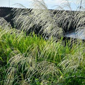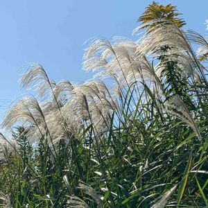 オギ 日差しにキラキラ✨白く輝くオギの穂 イネ科ススキ属