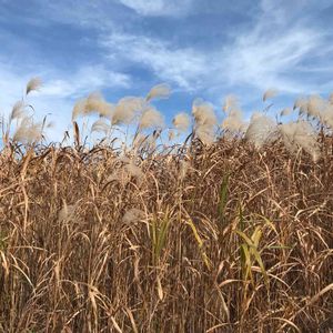 オギ(荻) 今朝投稿のススキと比べ、穂の先端に芒はありません。 ススキに比べると水辺や湿原等水分が多い場所がお好み。 ススキのように株にならず、まばらに間隔を開けて生育します。 ⬆️河原で群生していました♬ ススキの花序の色は黄褐色〜黄金色に見えますが、オギは秋になると白銀色に見えます。 ススキとオギを優しくニギニギ👊してみました。 オギの方がやわらかかったなぁ☺️