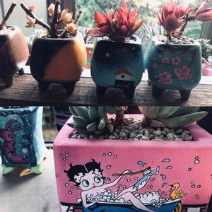 リメイク鉢シリーズその1です😊 友人の奧さんが多肉好きで、器用で絵心あり手作り粘土鉢も色々ありました👌何かの漫画の写し?もらってきた鉢の一部です。肝心の多肉植物の種が不明です😅