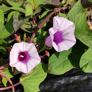 『サツマイモ』 ☀️夏のある日のお話し 🍠の天ぷら食いてえ〜。と、次男が、いうので、 天ぷら蕎麦にしましょう🤗。 紅あずま🍠一個。 お茄子🍆。 シシトウ、無ければ🫑。 舞茸🍄 海老🦐 天ぷら蕎麦。 美味しく頂きました🙏。 大きな🍠。半分も残した。すっかり忘れた😱。 気が付いたら野菜籠の中で🌱が出てたから🫣、鉢に埋めてあげたら、こんな具合🤩 室内で育ったせい🤔 お花は、稀。希少よん🤩。 今じゃ🌱茎みたいに、鉢から這い出して、逃げてしまいそう😱。 花言葉 「乙女の純情」「幸運」 ゴツイ、外見にしては、可愛い花言葉😍
