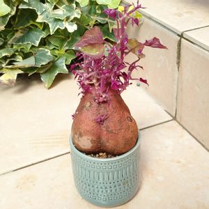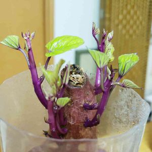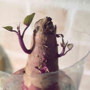 去年の秋に収穫したベニハルカ🍠 暗所保管にもかかわらず、葉がもりもり出てきたので、鉢に植え付けて栽培スタート🎵 可愛い観葉植物のできあがり🤭