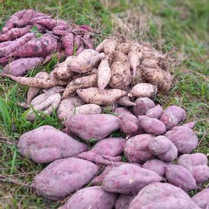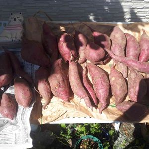 サツマイモ🍠収穫してみました。 (☀️天日干ししてます。) たしか品種はハロウィーンスィートとあいこまちだったかな⁉️ すぐに食べても美味しくないため、(甘くない)収穫して1ヶ月後ぐらいから食べ始めます。