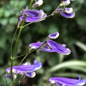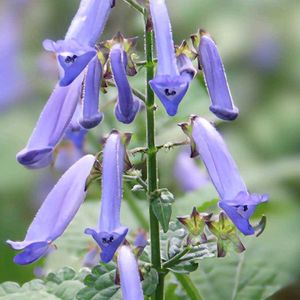 秋丁字(アキチョウジ) シソ科ヤマハッカ属の多年草。山地の半日陰に生える。高さは1mほどになる。長楕円状の葉は対生する。花期は8~10月。花は青紫色、筒形で胴長、花先は上下に開いた唇形。花の中に4本の雄しべと1本の雌しべがある。萼は朝顔形で先が5裂する。 秋咲きで、丁子(ちょうじ💬フトモモ科の樹木で、花の蕾を乾かしたものをクローブといい、香料に使う)に似た花を咲かせるのが名前の由来。 よく似た関屋の秋丁子(セキヤノアキチョウジ)との識別点は次の通り 秋丁子 ・花柄は1㎝以下と短く、細毛がある ・萼片が尖らない ・花序の幅が狭い ・岐阜県以西に分布する 関屋の秋丁子 ・花柄は1~2.5㎝と長く、毛がない ・萼片が細く尖る ・花序の幅が広い ・関東と中部地方に分布する 出典『山に咲く花』『秋の野草』『四季の野の花図鑑』『野草の名前 秋冬』