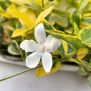 おはようございます ☘️ 斑入り葉の枝が滝のように垂れる花 今年は、花が一輪咲いてくれました 🤗