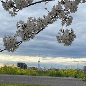 🌸*✲゚*🌸*✲゚*🌸🌸*✲゚*🌸 江戸川の桜🌸満開✨✨ 東京スカイツリーと菜の花をバックに🌸🌼 今日、千葉市川の弟から 送られて来ました❣️ 大阪の桜も五分咲きくらい でしょうか🙂😻🍀