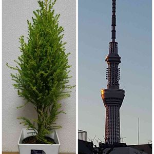 今朝の東京スカイツリー 朝陽に輝いています。 am.6:40 我が家のコニファー🎄 スカイツリーと背比べ❗