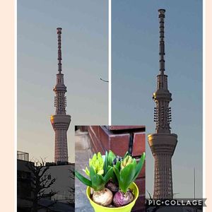 今朝の一枚 東京スカイツリー(左)am.6:30 (右)am.6:40 中:ヒヤシンス、3色の苗です。