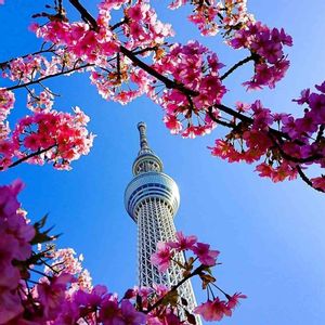 今日は亀戸🚶♂️ リキュウバイとスカイツリー👀 青空と白い花が良い感じです🎵