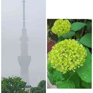 今朝の一枚 左:今朝の東京スカイツリー、朝もやに煙っています。 📷 am.6:30 右:我が家のアジサイ・アナベル 今にも咲きそうです✨