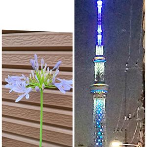 左:朝の散歩🚶中に見かけたアガパンサス 右:今夜の東京スカイツリーライティング。今日の聖火リレー、青森県をイメージしているそうです。📷 pm8:30