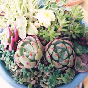 最近の戦利品を寄せ植え(*´∇`*)💕 mayunoさん缶🥫 小町娘 ✨merrybell さん E.マリア✨Lierさん ブルービーン✨marry bellさん なぺ子さん鉢🌸 プリズム✨レポスの多肉村さん