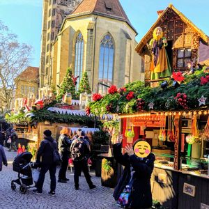 ドイツの7都市のクリスマスマーケット観光に来ています。 1都市目はシュツットガルト のマーケットの様子。 市場では知らない果物やクリスマスローズの花、ツリーの飾りがいっぱい売ってあります。