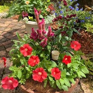 ちょっと寄せ植え(赤バージョン) *\(^o^)/* 余り花が付いてない時に成長した時のことを想像しながら植えました😊 植えてから3週間、まだ咲いてない花もあるけ・・・撮ってみました🎶