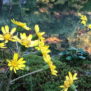 花水木さんに つわぶき と教えていただきました🌱 苔の中 あちらこちら 黄色のお花🌼 池は庭園の色彩も映して ゆらめく鏡のよう