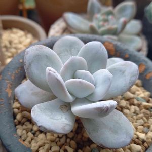 9月に一度投稿したラウィのその後の姿。この2ヶ月は日当たりのいい場所に置いてあったおかげか,前の姿と比べて全体的に白さが増して葉も肉厚になった。 9月の画像では写っていた,これ以外の3個の葉挿しラウィもそれなりにそれぞれ成長中。