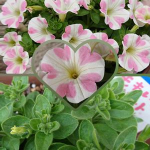 サフィニア ・*:..。o♬*゚✨ ナス科 ツクバネアサガオ属 この子はサフィニアアートの大人気 ももいろハート💗✲゚ฺ*:₀。*✲゚ฺ*: 去年初めてペチュニアさんをお迎えして、冬越しもクリア🙆 今年は👀をつけていたこの子をお迎えしました~🎵 🏷️には “サフィニアアート💠” ん❔🙄 ペチュニアさんとどこが違うの~(?_?) ❤サフィニア❤️ その昔、 ☔🌁☔🌁に弱く、花が少なく、人気がいまいちだった「ペチュニア」さん(◞︎‸◟︎ㆀ)ショボン そこで、サントリーさんは バイオテクノロジーの技術で品種改良し、超ロングセラー商品を開発🙌 1990年、大阪で開催された花の万博で「サフィニア」が大ヒット🎉😉❤️ 一躍センセーションを巻き起こした園芸界のホープなの🎵 それまでのペチュニアさんにはなかった、豪華に咲きしだれる花と育てやすさから、幅広い層に支持され、「ガーデニングブームの火付け役」となりました🤗 その人気は衰えることなく、さらに進化を遂げ、様々な品種が出揃って、 すでに王者の貫禄漂う、凄いお花💠なんです〰️👀〰️💕 ❤サフィニアの命名❤️ 〈寄せる波〉を意味するサーフィンにペチュニアの語尾をつけた造語☝️ 匍匐した枝に波打つように次々と花が咲くことに由来するの😆 ❤花言葉❤️ 「咲きたての笑顔😊」 可愛らしい花姿💠ににっこり◡̈⃝⋆*◡̈❤︎せずにはいられません🥰 ❤サフィニアアートの特徴❤ 💠花弁にユニークな模様が入る印象的な咲き姿 💠生育・分枝力旺盛で育てやすい🎵 💠ボリュームある中輪の花がたっぷり‼️ さて、うちの “ももちゃん💗” はどんなお花💠かというとね❤️ ご覧の通り、花弁にピンクの💗がのる、かわいいお花💠なの 5月の終わり、HCで、“ももいろハート💗”の🏷️がついた苗を見っけ👀〰️💕 ”葉っぱ🍃だけの小さな苗をお迎えしてお花💠を心待ちに꒰* ॢꈍ◡ꈍ ॢ꒱.*˚‧ 数日後、蕾ちゃん発見🙌 黄色💛❔*Ꙩꙻ₀Ꙩꙻ)! ピンク💗じゃないんですけど(((^_^;) ももいろ💗咲くのかしら❔🙄 不安がつのる数日間(((;꒪ꈊ꒪;))): 💛のお花咲いたらどーしよー(;゜∀゜) 早く開かないかなー❔ෆ❛ั◡❛ัෆ✩⃛*⁎ドキドキ そしてついに開きました~⁽⁽٩(๑˃̶͈̀ ᗨ ˂̶͈́)۶⁾⁾💕 まぎれもなく “ももいろ💗” 咲きたての笑顔😊だ〰️💓😍💓 嬉しい₍₍٩(*ˊᵕˋ*)۶⁾⁾ そしてみるみる💗💗💗💗💗 満開に・*:..。o*💠 💠ʚïɞ.•*¨*•.¸¸•*💠ʚïɞ.•*¨*•.¸¸.•*💠ʚïɞ.•*¨*•.¸¸ こんなかわいいお花💠を開発した方にインタビュー🎤 🎤ももいろハート💗誕生秘話🥰 自分で交配をした花が店頭に並ぶには、少なくとも5年かかるのですって( ⊙⊙)!! でも、育種には交配だけでなく、その結果生まれたたくさんの花の中から「これは商品になる💡」というものを選抜する仕事があるのだそう☝️ 初仕事は、ももいろハート💗の選抜だったそうよ😊 このお花は、育種の難易度でいうとそれほど高いものではないんだって😉 花びらにのったピンクのハート模様が特徴ですが、肥料や管理でその形が変わります✨ 「変わる」ということは品種として安定していないということなので、ブリーダーは通常、それをプラスには評価しないんですって😵 なので、最初の商品会議では、やはりあまり評価されなかったようです😣 でも、肥料のやり方やお世話しだいで花びらの模様が変わるのって、ひょっとしたら楽しいことじゃないかな🤗 育種初心者ならではの逆の発想で、それを営業の担当者に話すと、「おもしろいことをいってくれた‼️」と👌 そこで思いきって社長さんにも直接商品コンセプトをアピールしたところ、ゴーサインが出たんですって⁽⁽٩(๑˃̶͈̀ ᗨ ˂̶͈́)۶⁾⁾💕 小さな頃からお花好きの少年だったこの方からのメッセージ・*:..。o♬*゚✨ 皆さんにもお届け致します( ᴗ͈ˬᴗ͈)◞❤︎*˚ 【一輪を咲かせる満足感はなにものにも変えられません。 どうぞ、ひとつひとつの花を見てください。 その想いを、ももいろハートにも込めています🤗】 初めて🏷️19日はピンクの日! お邪魔させてくださいませ(❀ᴗ͈ˬᴗ͈)⁾⁾ᵖᵉᵏᵒ