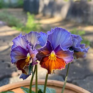 ビオラ ヨコハマセレクション 💙フレアーブルー 植え付けました ちょっとニュアンスの違う3株💙 7号の鉢に3株 ちょっと隙間あります💦 4株買ってくればよかったなー😅