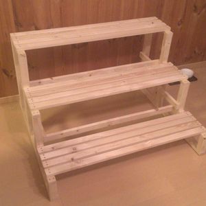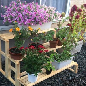 いいサイズのフラワースタンドが無かったので、自分で作ってみました。1×4材を駆使した木製で、初めて作ったにしてはなかなかの出来に仕上がったと思います。 これでプランターや鉢を、余裕を持って置けるようになるはず。 (幅900×奥750×高500)