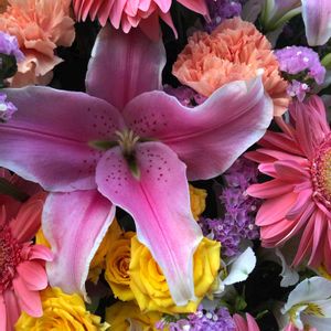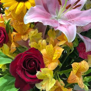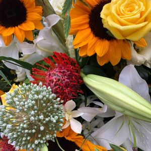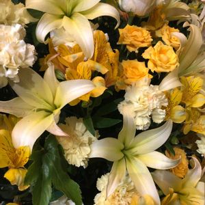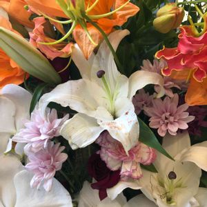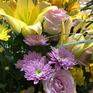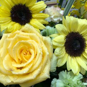 幸せ色なお祝い花🌼なんだけど隣がこないだpicしたスカイブルーの百合でした(^^)♪ 笑っ。
