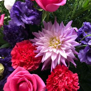 会社近くにOpenしたお店の お祝いスタンド花☺️ 左上から大輪のダリア💕 ミニ薔薇🌹 淡い色のトルコキキョウ etc… 優しい雰囲気に、仕事帰りにホッとさせられています🤗 先週はサッカー元日本代表選手からのスタンド🌸 もありました⚽🏃♂️️💐タッタカタ~ Goal !!