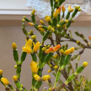 今日は風が強いけど暖かいですね〜 森林サボテンも開花期ですね🥰 ハティオラ猿恋葦は満開✨ 小さいこんぺいとうみたいな黄色のお花がかわいいです 右上は1ヶ月前にお迎えしたイースターカクタス その時は赤いつぶつぶだった蕾がだいぶ大きくなりました😆💕 開花が楽しみです🎶 左下は前に育ててたイースターカクタス すごく大好きだったのにダメにしちゃいました💦 今回は枯らさずに夏越し頑張りたいです シャコバサボテンより難しいけどイースターカクタスの方がお花が好みです❣️