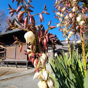 ユッカ ドッグラン隣接の植物園で。 トゲトゲした葉っぱの間から、花茎を伸ばして、鈴のような花が咲いていました。 次々と成長する様子から、青年の木とも呼ばれるそうです。