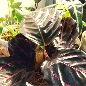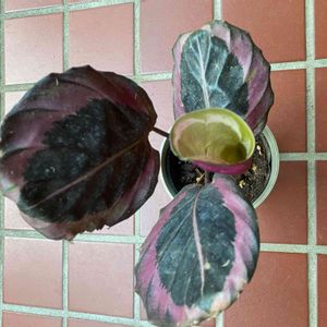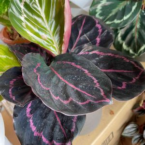 カラテア ドッティ。 五色トウガラシの居場所、空いたので。そこに。 レックスベゴニアを育ててピンクの模様が入った葉っぱが素敵だなと思ったから今回もピンクの模様入りの品種を選びました!