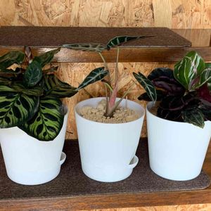 カラテア・マコヤナ、アロカシア・バンビーノ、カラテア・ドッティ ダイソーの底面給水鉢(商品名・組み立て植木鉢)に植えました。皿要らずだから扱い易いんです。
