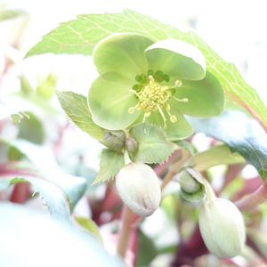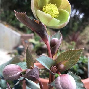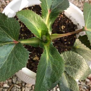去年、お勤め品を購入。 花色はグリーンでシングルの クリスマスローズ。 花芽がついていました。葉の形が ちょっとかわったクリロさんです。