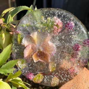 おはようございます☀ 冷たい風の朝です。 氷アートやってみました✨ 冷え込むというので一昨日の夕方仕込んでおきましたが昨日の朝は凍っていなくてガッカリでしたが、今朝見たら完全ではないですが固まっていました♪ キラキラしてて綺麗✨✨ 寒さも楽しめる?😁ね🎶