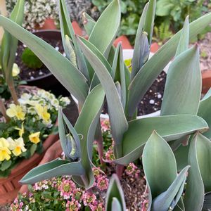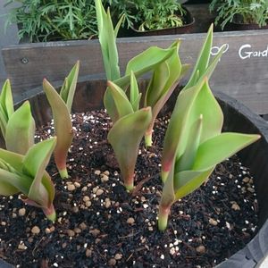 タキイの冷凍チューリップ チューリップ赤色のパーロット咲きロココとピンクのアリッサム 先週暖かかったから蕾が上がってきています。 明日から寒くなるから心配⛄️ 避難させねば🤔