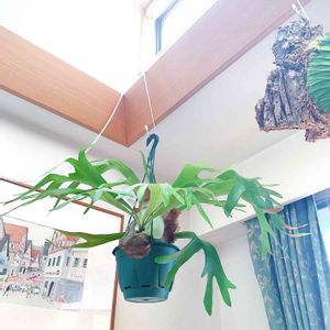 ビカクシダ・ネザーランド 天気の良い日は外で風に当ててます。直射日光がそこまで当たらない明るいところ。 下側の水苔のカピカピに乾いたのでシャワーでたっぷり水浴び! 新しい胞子葉も出てきて元気です!貯水葉も出て早くカッコ良くならないかな~