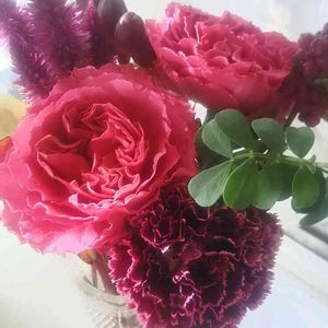 娘がお祝いにブーケ💐を買って来てくれました😍 嬉しい💕 フリフリの薔薇と、大人っぽい色のカーネーションがとっても綺麗です✨✨😃💓