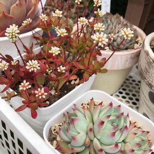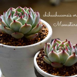 葉挿しから2年が経ち、立派な姿になりました 桃太郎かチワワエンシスです っと言うのも、違いを改めて検索すると、だいたいの方は葉の形 簡単に言うと、シュッとしてるのが桃太郎で丸っこいのがチワワエンシス でも全否定の販売店の方のブログがありました その方は、そんな物は育てた環境なんかで、いくらでも変わると‥ 一番の違いは花の形だそうで、細長い花がチワワエンシスで、丸っこい花が桃太郎だと 今までエケベリアの花は、体力温存の為にだいたいがカットするので気にした事が無かった この子達は、葉の形から桃太郎と思っていたけど、大量の葉挿しの中に名前無しでチワワの葉挿しもしていたので、その販売店の方が仰る事が本当なら違う可能性が出てきた ガ━︎ン(。。*) 今年はお花で確認してみよう(๑•̀ㅁ•́๑)✧︎ どっちかな⁉️ 楽しみ(๑ˇ∀︎ˇ๑)″°∮︎*.♪︎ 確認したら直ぐカットするけど(-人-;)