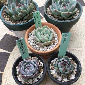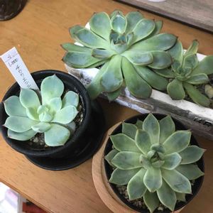 パート2! 上の列 多肉専門店で購入。 チワワエンシスさん 桃太郎さん 桃太郎さん葉挿し(下の列の黒いポット) 下の列 100均のチワワエンシスさん達。。。 葉挿しの黒いポットは桃太郎さんからの葉挿し。