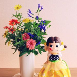 おはようございます😊 だいぶ久しぶりですが、ペコちゃん祭りに参加します。 2025レモンスカッシュ柄ドレスのペコちゃんと庭のジニアです🧡