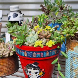こんにちは♪ 🏷️ペコちゃん祭り fumi fumiちゃんからいただいたペコちゃんの鉢、オブジェ、ミルキーピック💕 ペコちゃん鉢にリバーシブル寄せ植えしました😊 pic1と3が表、pic2と4が裏 どちらから見ても可愛い寄せ植えは難しかったけど😅 久しぶりの寄せ植え楽しかったよ💕 前にお迎えしていたDAISO多肉のヘラクレス、シルバースター、ヌダの3種類をメインに寄せ植えしました🍀 pic2と4の左のはfumi fumiちゃんにいただいたリメ缶にいただいたアーモンドネックレスを植えてます🥰 アーモンドネックレス増やしたい👍 fumi fumiちゃんたくさん可愛いハンドメイドありがとうございます♡