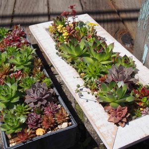 センペルリース😊セダムも入ってます🌿 これは最初に作った多肉リースです😉 こちらも土台から作りました。 前回より少し増えてます〜👍 箱はDIYで作った物です。 これに先日いただいた花恋水を使ってます👍
