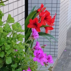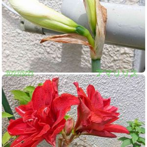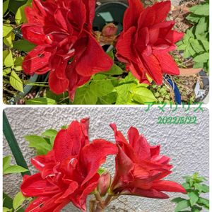 自宅のベランダでは、 赤色のアマリリスが2つ咲きましたね。 白色は蕾を2つに増やしました。 2022年5月22日撮影
