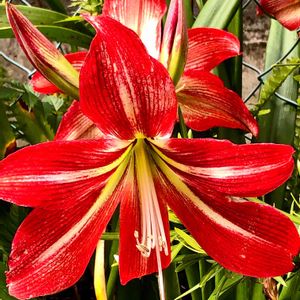 こんにちは😃🌤☀️ 素敵なアマリリスの花咲きました❤️❤️🌺 かたかごさんの 🏷真っ赤な火曜日 ◎ アマリリス 5月の半ば、日ざしも強まる初夏のころになると、アマリリスの蕾が緑色の顔を覗かせます。花梗は日ごとに力強く伸び、やがて子どもの顔を隠すほどの大きな花を咲かせます。花弁は光が当たるとネリネの花のようにきらきらと光沢を放つようなものや、フランネルの生地を思わせるような花を咲かせて、見る人を魅了します。 春植え球根として扱われているアマリリスは、園芸上、アマリリスと呼ばれていますが、植物学上はヒペアストラム属の植物で、正真正銘のアマリリスは南アフリカ原産のアマリリス ベラドンナと呼ばれる球根植物です。 原産地は熱帯アメリカで、約80種の原種があります。ヨーロッパへは18世紀後半に2~3種類の原種が入り、19世紀には交配が始まっています。日本への渡来は江戸時代の天保年間に原種が入り、交配種は昭和初期より品種名のない丸弁系や剣弁系として輸入され、日本でも改良が行われました。 最近オランダで急速に改良が進み、大輪で色彩鮮明、花弁が厚く、花もちもよく、さらに茎が太く短く、丈夫で倒れにくいすばらしい品種が続々と発表されています 裏庭に大きな大きな真っ赤なアマリリスが咲いています。 (((o(*゚▽゚*)o)))❤️❤️❤️🌺🌺🌺 存在感があります((o(^∇^)o)) 今日も穏やかな一日になりますように。 ♪(๑ᴖ◡ᴖ๑)♪🎀🌸💖❤️🌺🌺🌺❤️💛🍀