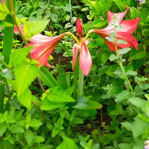 昨年、アマリリスの球根を 庭のあちこちに植え、忘れていました。 今朝他の植物の中から、ひょっこり咲いていました かわいいね💕
