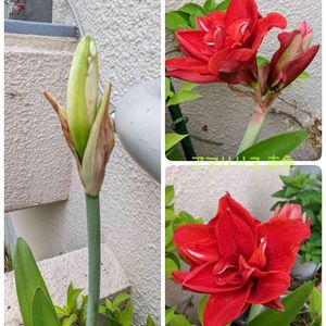 【再編集済】 赤色の八重咲きアマリリスが咲きました‼️😍 白色のアマリリスも 順調に背丈を伸ばしています。 自宅のベランダにて。 2022年5月20日撮影