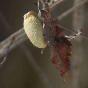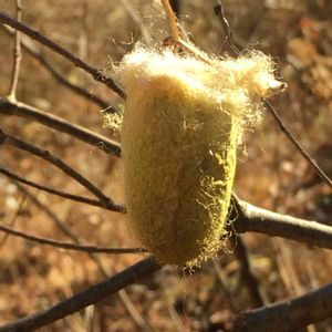 クヌギと黄緑色のヤママユの繭 山繭 ヤママユ ヤママユガ科 ヤママユ属 分布 北海道 本州 四国 九州 南西諸島 ヤママユの成虫は10センチを超える大きな蛾。 ヤママユは春に卵から孵化し、幼虫はコナラなどの木 の葉を食べて育つ。夏の終わり頃に繭を作り秋に羽化する。 幼虫は クヌギ・アベマキ・コナラ・カシ ワ・カシ類・クリ(ブナ科)、サクラ類・リン ゴ・カマツカ (バラ科)、ヤマモモ(ヤマモモ 科) など を食べる。 この繭からとれる天蚕糸は太く、一つの繭からとれる長さは家蚕の半分。 天蚕糸で織った絹織物は淡い緑色で美しいが天蚕の飼育が難しいのでとても高価。 着物の雑誌で天蚕糸で織られた薄黄緑色のとても美しい着物を見たことがある。この繭なんだと実際に見ていたく感動。 この地域に多いクヌギの枝についていた。 後ろに見える太い木がクヌギ。 追記 午後2時 ヤママユがの幼虫は6月中頃から繭をを作り蚕の期間は50日だそうです。 これでいくとこの時期に繭が見つかるのはおかしいのではないかと気が付きました。 この繭の近くにも別の繭もありました。 季節外れの繭のようです。 それからはちなつめさんから教えていただいたのですが抜け殻かもしれないと。 そして羽化出来なかった蚕が中に残っているのもあると調べていてわかりました。 ---うさこさんからいただいたコメントで羽化までが長すぎると思い気が付きました---