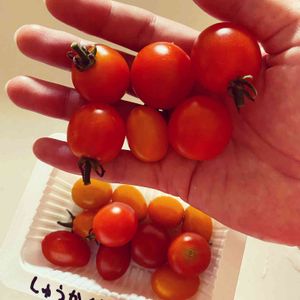 プチトマトが収穫できました😆✨ 黄色?オレンジ?と赤です。 収穫を楽しみにしていた娘が採ってくれました。 そのまま洗っておやつでぱくり、娘が言うには美味しかったそうです😋 まだまだたくさん実があるから、いい色になったら食べよう✨