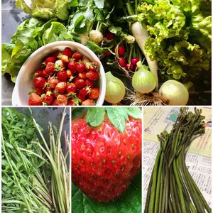 ⬆️野菜実家から届きました キャベツ サラダ菜 サニーレタス カブ 大根 ラデッシュ 新玉葱 そしていちご🍓沢山 ↙️裏で取ったセリとフキ↘️ワラビ 真ん中⬇️家の初いちごちゃん🍓