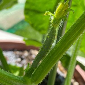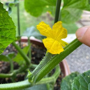 きゅうりです🥒 昨日投稿したきゅうり、今日は花が咲いてました🤩 チビきゅうりの下のもじゃっとしていたところは蕾だったということ? トマトと違って、花が終わったら実が出来るっていう順番じゃないんですね。植物を育てるって勉強になる😆