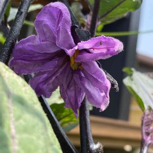 ナスです🍆 写真の撮り方が下手だけど、花が咲きました😆やっと咲いた! ちょっと前にタカノツメも咲いた写真をアップしたけど、雌しべと雄しべのあたりが似ているみたい。ナス科同士だからですかね。 ちゃんと実がなるといいな〜😘